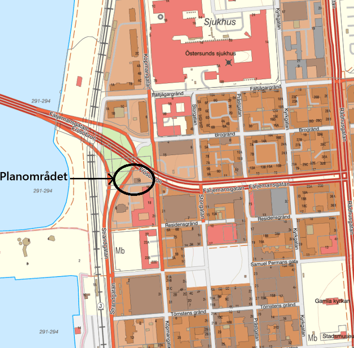 Större delen av fastigheten Auditören 4 används för trafikändamål med Frösöbrons påfart och gator.