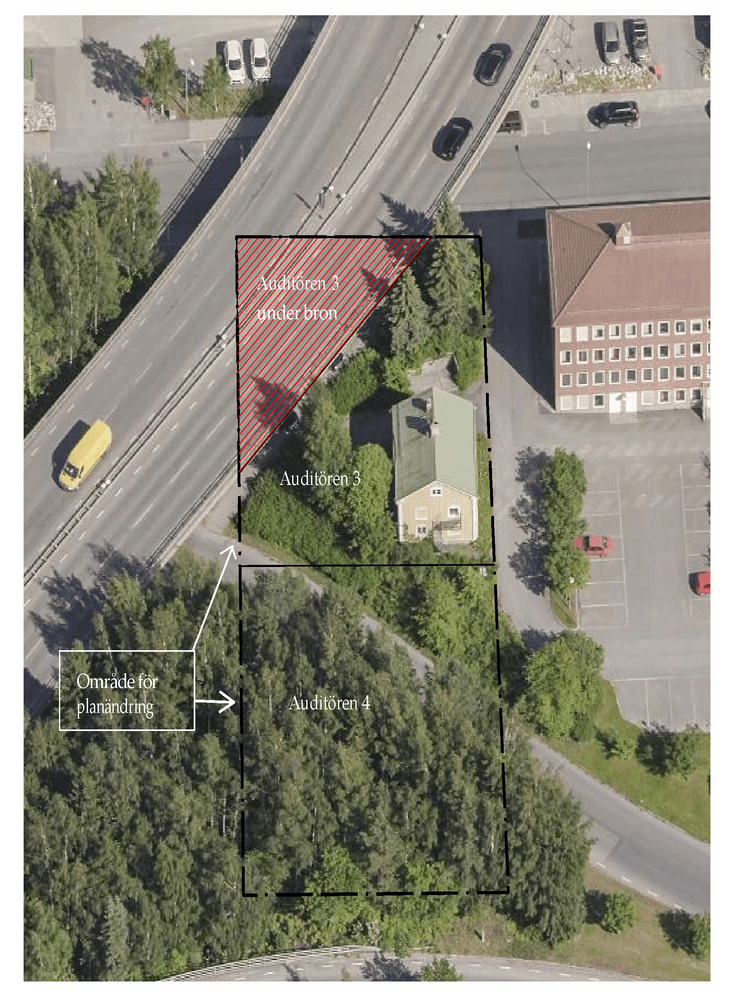 Tomtindelningen är inte anpassad efter hur det ser ut idag eftersom Frösöbron och påfarterna omfattar delar av fastigheterna Auditören 3 och 4. Den har därmed spelat ut sin roll.